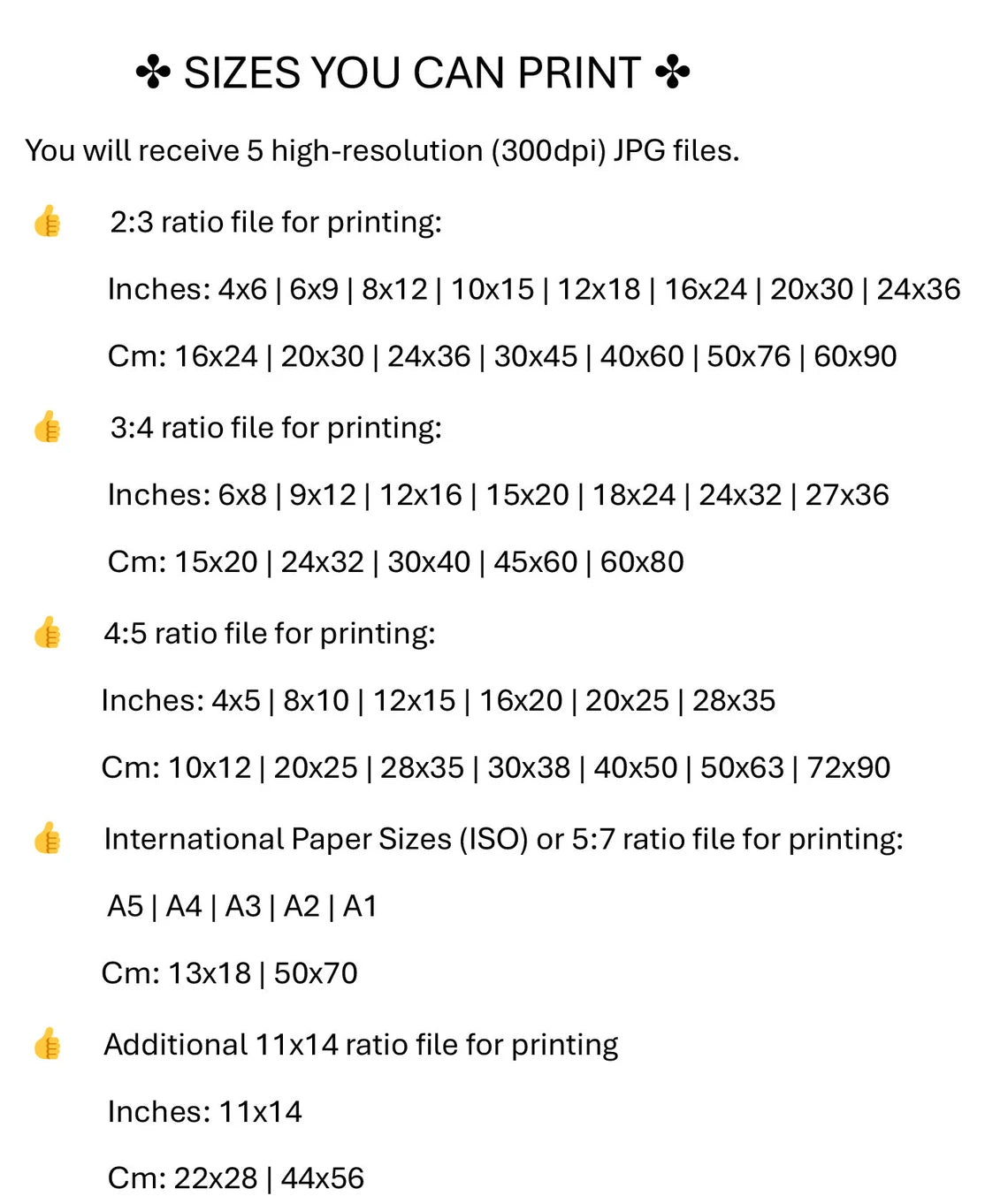 You will receive 5 high-resolution (300dpi) JPG files for each poster.